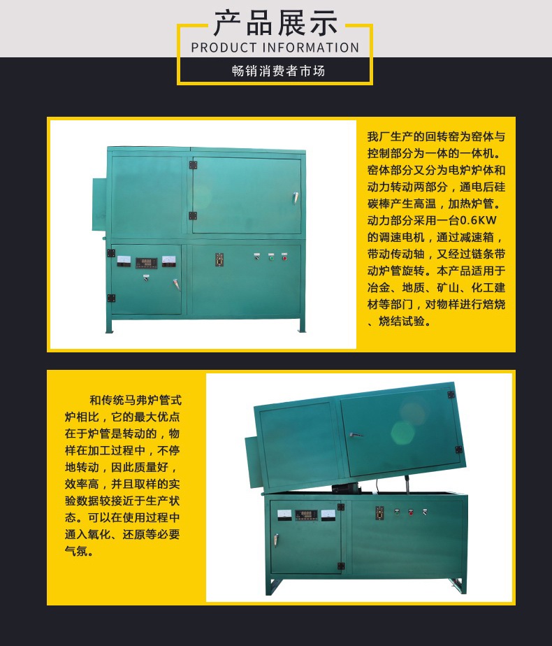本產品適用于冶金、地質、礦山、化工建材等部門,對物樣進行焙燒、燒結試驗。和傳統馬弗爐管式爐相比,它的最大優點在于爐管是轉動的,物樣在加工過程中,不停地轉動,因此質量好,效率高,并且取樣的實驗數據較接近于生產狀態??梢栽谑褂眠^程中通入氧化、還原等必要氣氛。