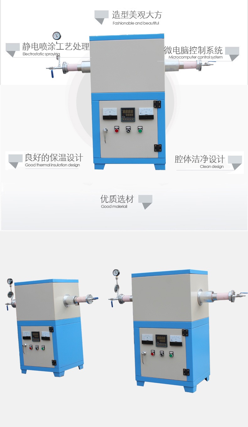 1.外殼采用鋼板這邊焊接而成,外表靜電噴涂,美觀大方。爐膛采用氧化鋁陶瓷纖維材料制成,加熱元件為硅鉬棒。工作室為優質高密度剛玉管,剛玉管的兩端配有法蘭裝置,可以對爐膛內部抽真空。也可以通入氣氛保護。